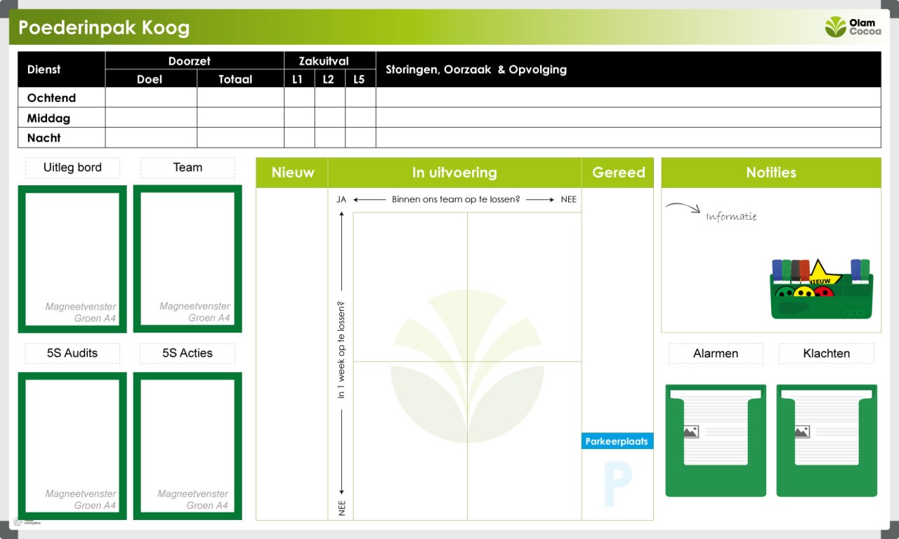 The “day starter” board for Olam Cocoa is entirely custom-made. The goals can be made visual on the board for each day. There is also a roster on the board which displays the amount of faulty bags as well as any disturbances and failures. We also reserved some space to visualize 5S Audits and possible actions that may spark from this. They also have the possibility to confine complaints and consequently display what actions are to be taken to resolve these matters.