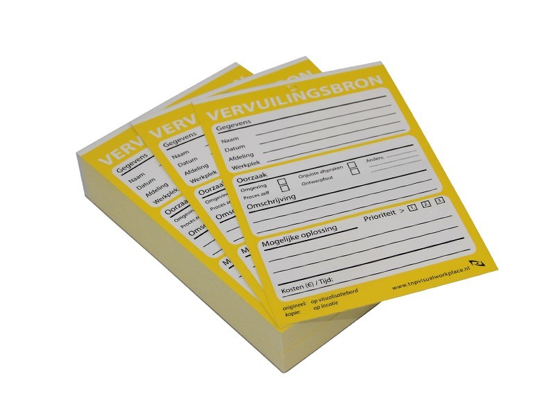 This 5S cleaning label is used in the implementation of 5S workplace organisation. The cleaning label can be hung in places where a source of contamination has been established as being present. This could be dust formation in a process or a leaking pipe in a department. On the cleaning label, it is possible to specify what source of pollution has been found, what the solution is and what priority it has. Use the colour scheme to support the status in a visual manner.